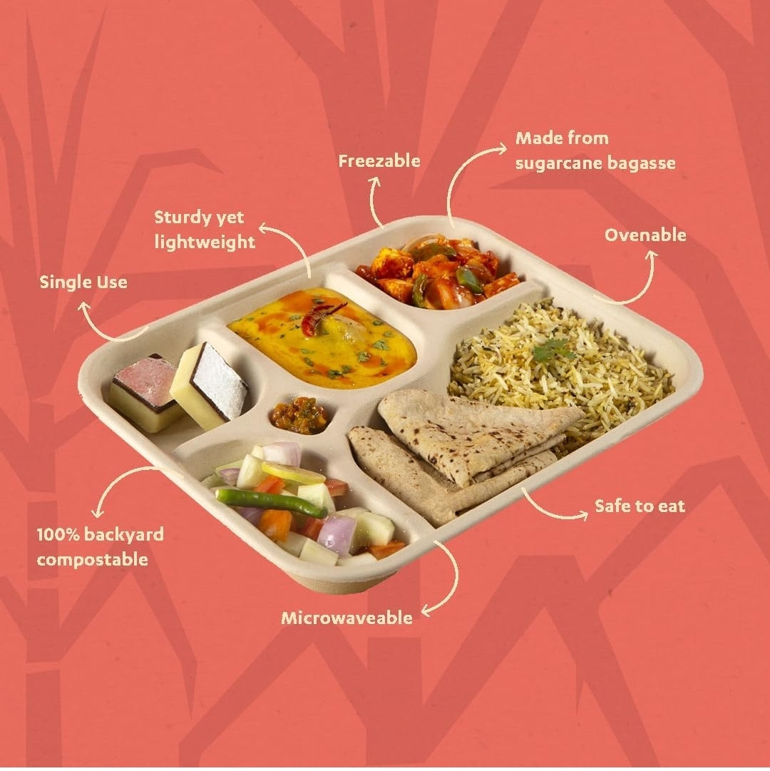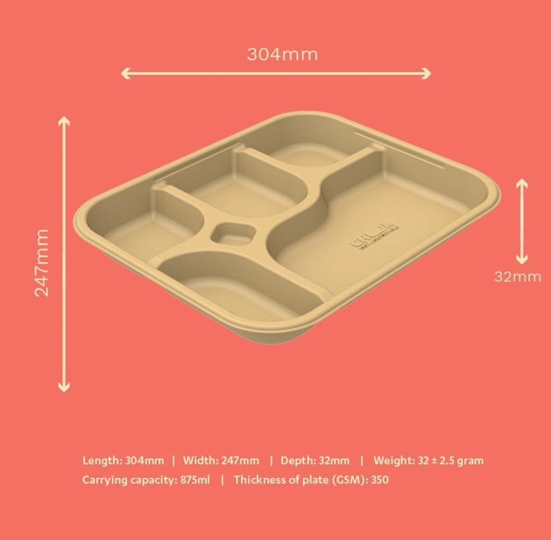 Eco-Friendly Bagasse 5 Compartment Meal Tray, Brown, Leak-Resistant, Compostable, Chlorine-Free, Modern Style